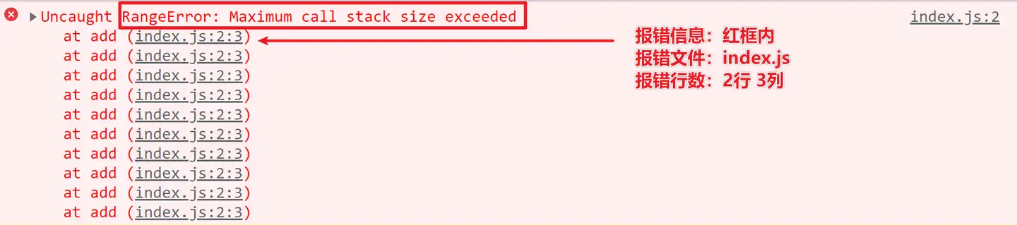 SyntaxError- 语法错误ReferenceError- 引用错误,通常是变量或方法没有声明,直接使用TypeError- 类型错误,通常是在错误的数据类型上,访问某个方法或属性RangeError- 死循环