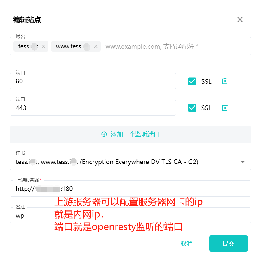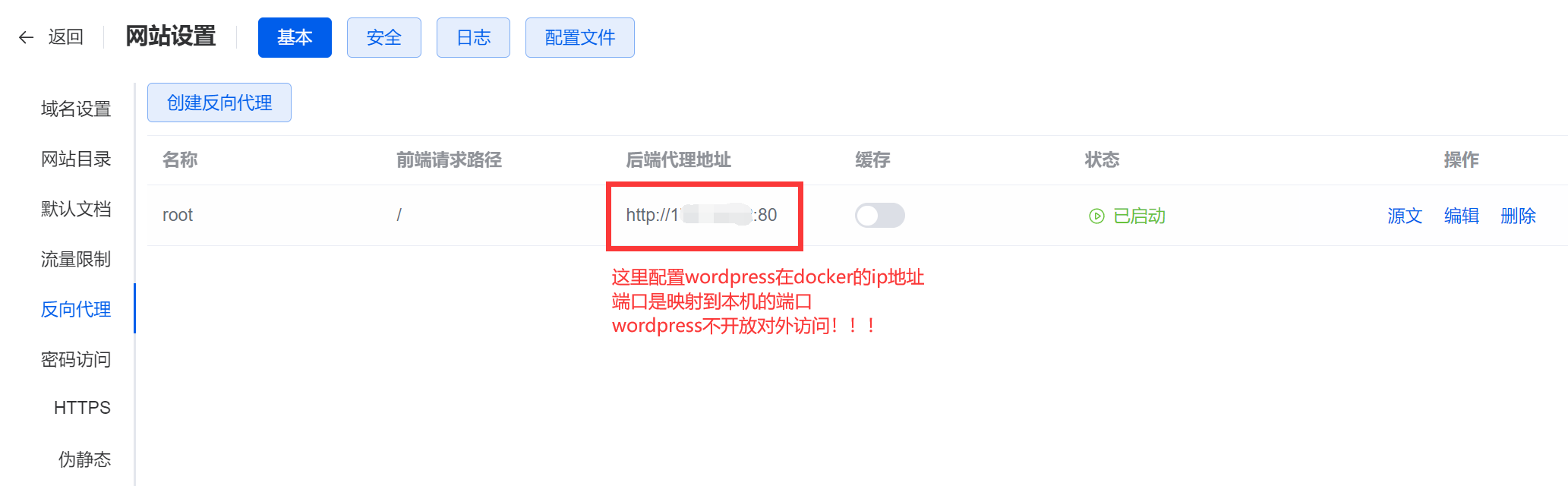 记住wordpress在docker的ip地址和映射端口,要配置在openresty的反向代理上。