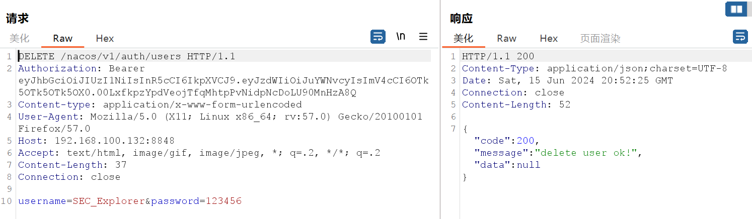 {"code":200,"message":"delete user ok!","data":null}Nacos token.secret.key 默认配置漏洞(QVD-2023-6271)