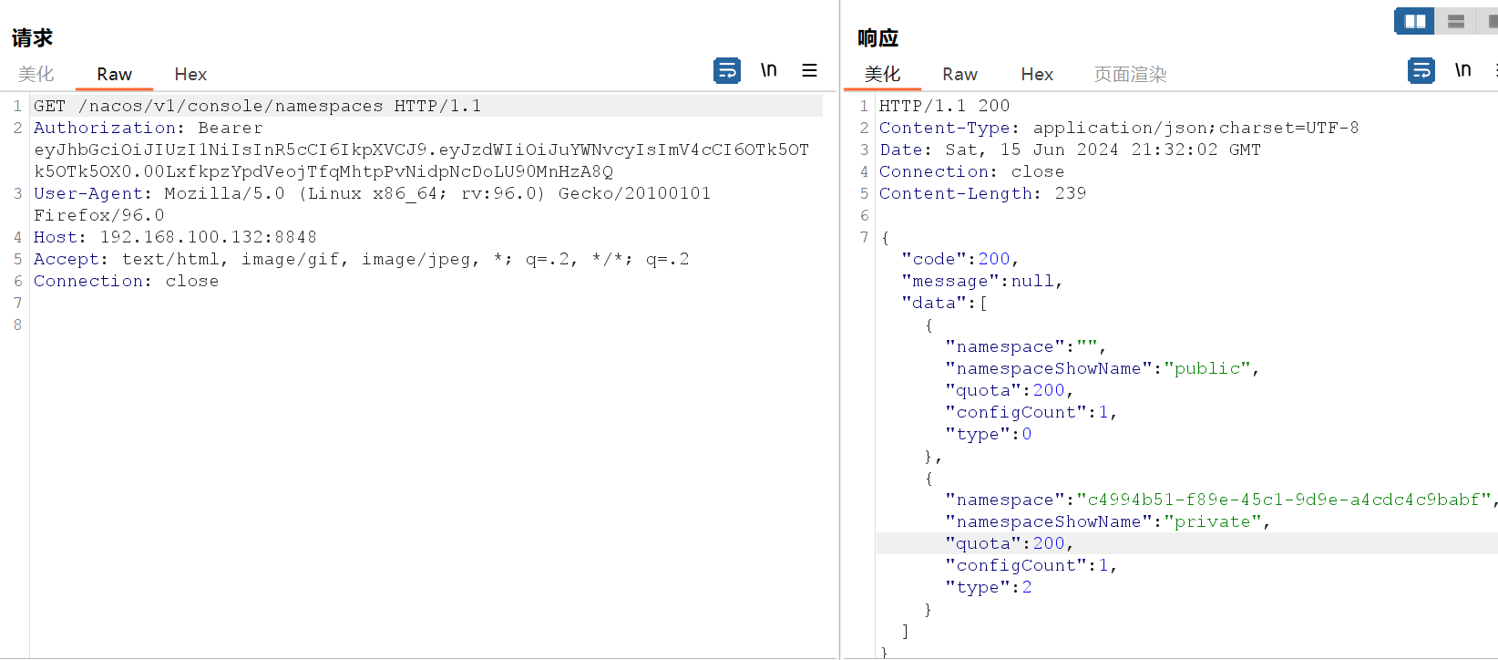 这时已经拿到了namespace、namespaceShowNmae,我们就可以根据之前的API光明正大的进行读取操作了,这里有个小技巧,之前读取配置里面的tenant参数获取的就是namespce,我们直接把tenant=test_namespace加进去构造请求,轻松读取到非public空间的数据