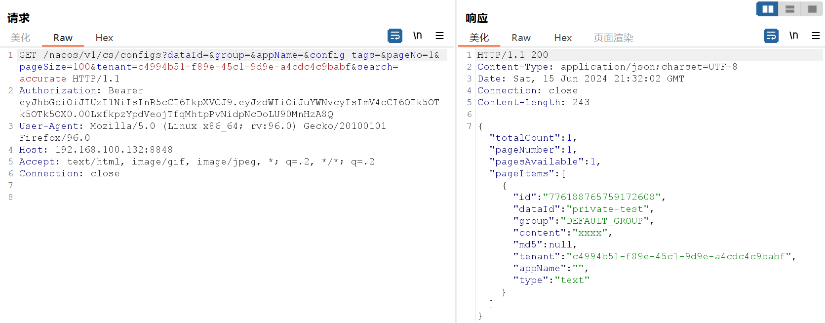 GET /nacos/v1/cs/configs?show=all&dataId=test&group=DEFAULT_GROUP&accessToken=eyJhbGciOiJIUzI1NiIsInR5cCI6IkpXVCJ9.eyJzdWIiOiJuYWNvcyIsImV4cCI6OTk5OTk5OTk5OX0.00LxfkpzYpdVeojTfqMhtpPvNidpNcDoLU90MnHzA8Q HTTP/1.1POST /nacos/v1/cs/configs?accessToken=eyJhbGciOiJIUzI1NiIsInR5cCI6IkpXVCJ9.eyJzdWIiOiJuYWNvcyIsImV4cCI6OTk5OTk5OTk5OX0.00LxfkpzYpdVeojTfqMhtpPvNidpNcDoLU90MnHzA8Q HTTP/1.1