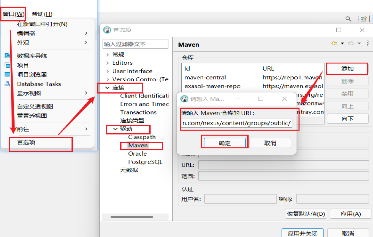 【窗口】→【首选项】→【连接】→【驱动】→【Maven】