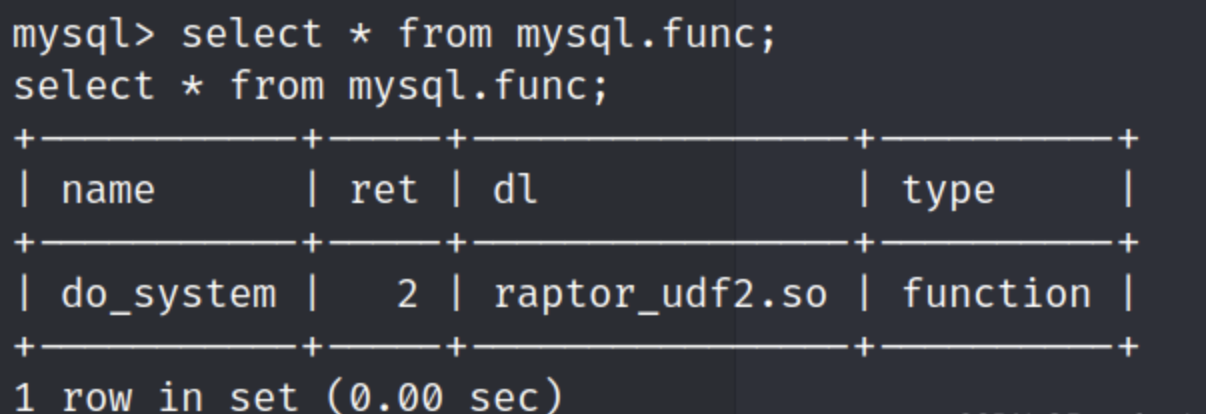 使用命令select * from mysql.func; 查看我们是否成功创建了函数,如下图,成功创建函数do_system。
