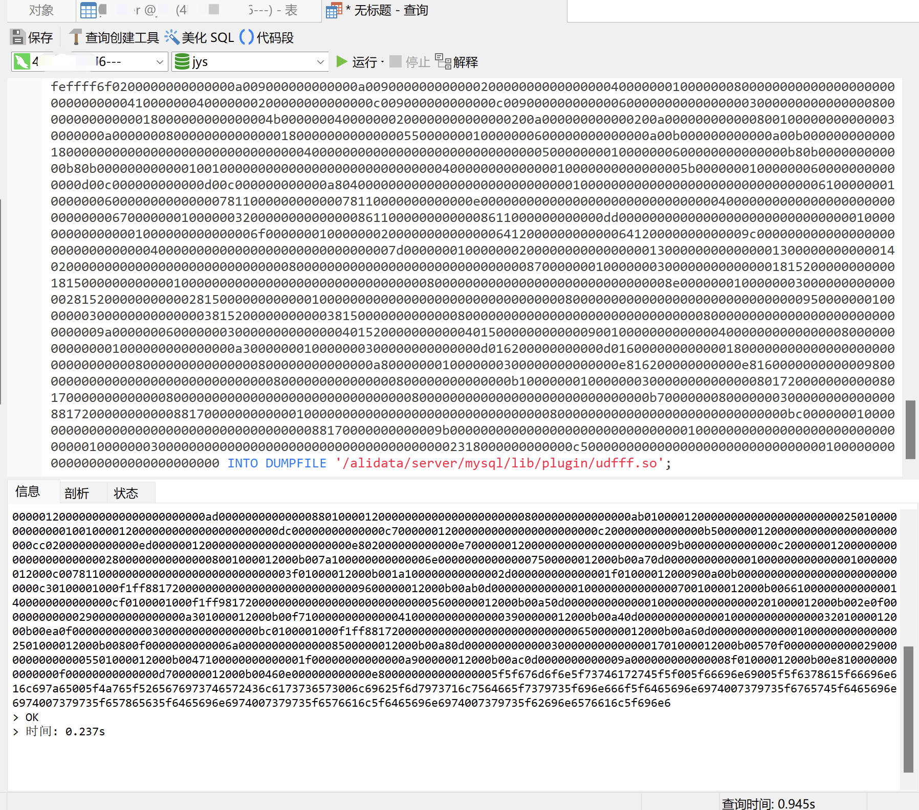 select * from foo into dumpfile '/alidata/server/mysql/lib/plugin/udfff.so';