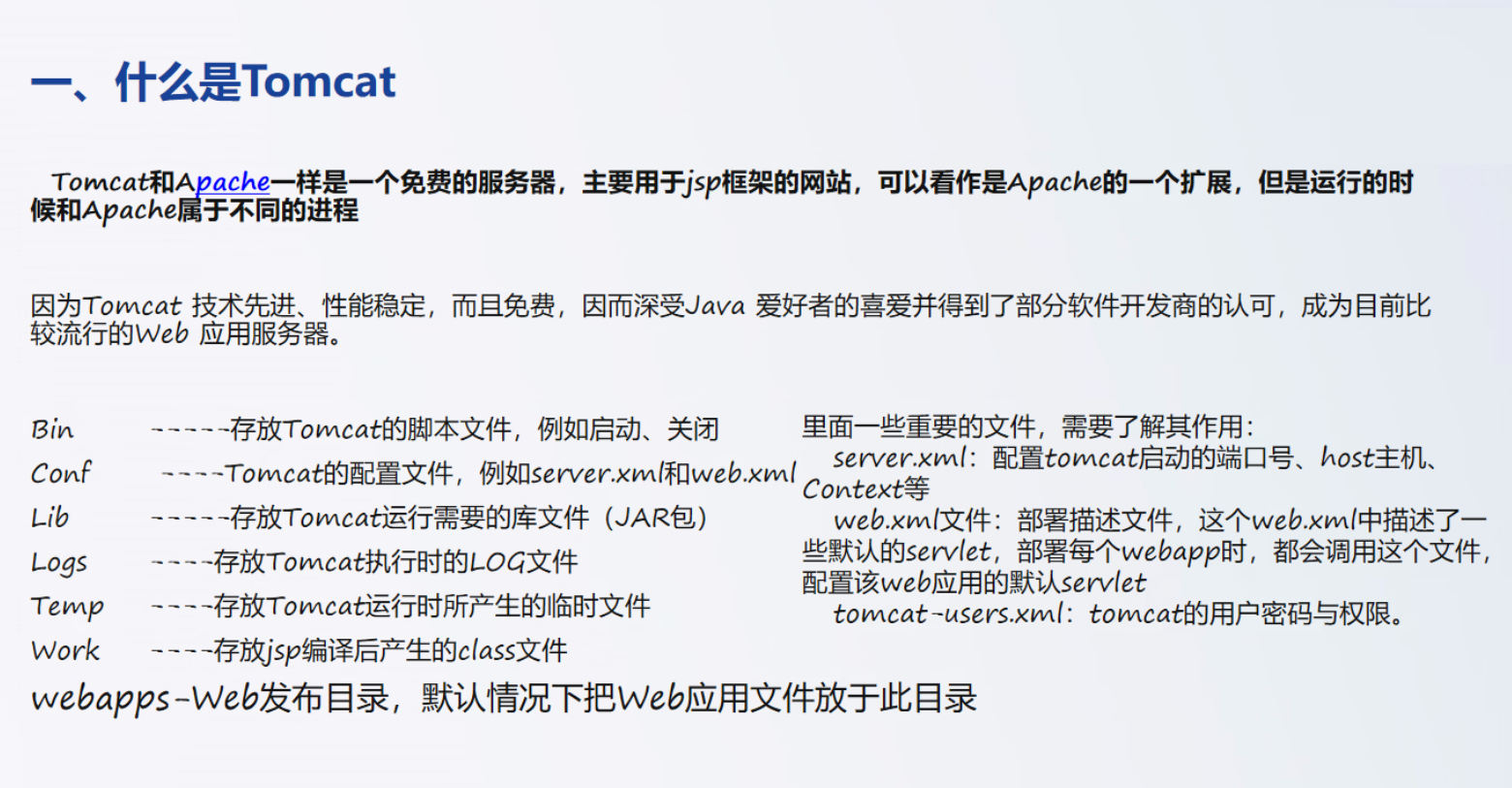 tomcat和apache一样是一个免费的服务器,主要用于jsp框架的网站,可以看作是apache的一个扩展,但是运行的时候和apache属于不同的进程。因为Tomcat 技术先进、性能稳定,而且免费,因而深受Java 爱好者的喜爱并得到了部分软件开发商的认可,成为目前比较流行的Web 应用服务器