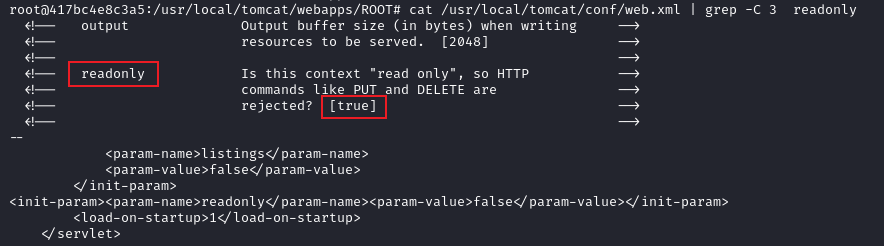 当web.xml中readonly设置为false时可以通过PUT/DELETE进行文件操控,漏洞就会触发。