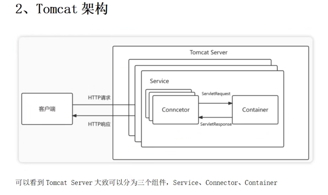 Tomcat能够通过Connector组件接收并解析HTTP请求,然后将一个ServletRequest对象发送给Container处理。容器处理完之后会将响应封装成ServletRespone返回给Connector,然后Connector再将ServletRespone解析为HTTP响应文本格式发送给客户端,至此Tomcat就完成了一次网络通信。