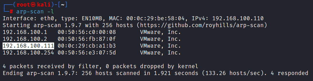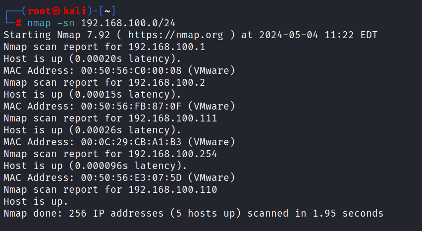 这里有人会写成192.168.100.1/24,写成100.1是不行的,因为后面跟着/24是代表一个网段,如果单独探测一个ip可以写成精确ip地址,但是现在我们是探测一个网段,是一个范围,所以要写成网络地址192.168.100.0/24