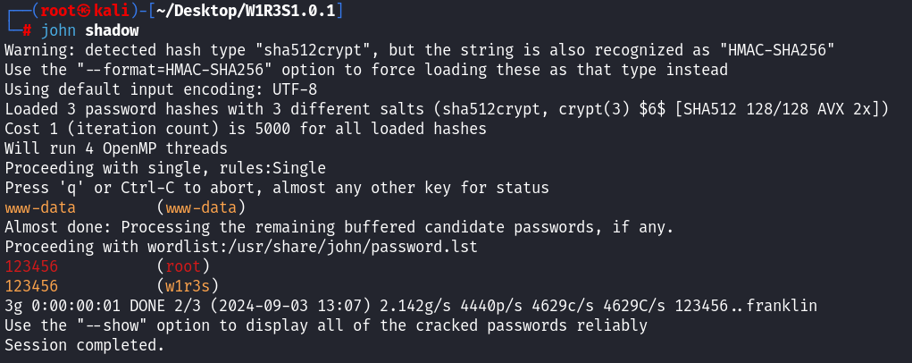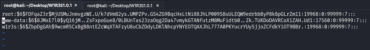 w1r3s:$6$ZbpDgGAh$9wcmR5CxBgB8ntEZcWqXTAFzyU8uCbZDdyLDKlNhcpYNYEOTQAXJhL777A0PKYucrYUySjjoZCFdkYiOT9BBr.:19968:0:99999:7:::