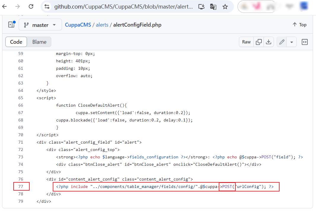 http://target/cuppa/alerts/alertConfigField.php?urlConfig=[FI]