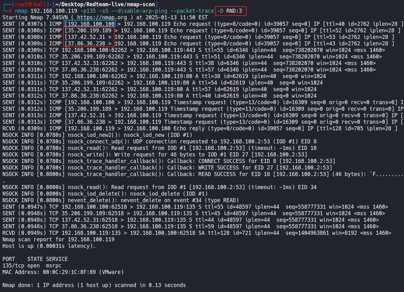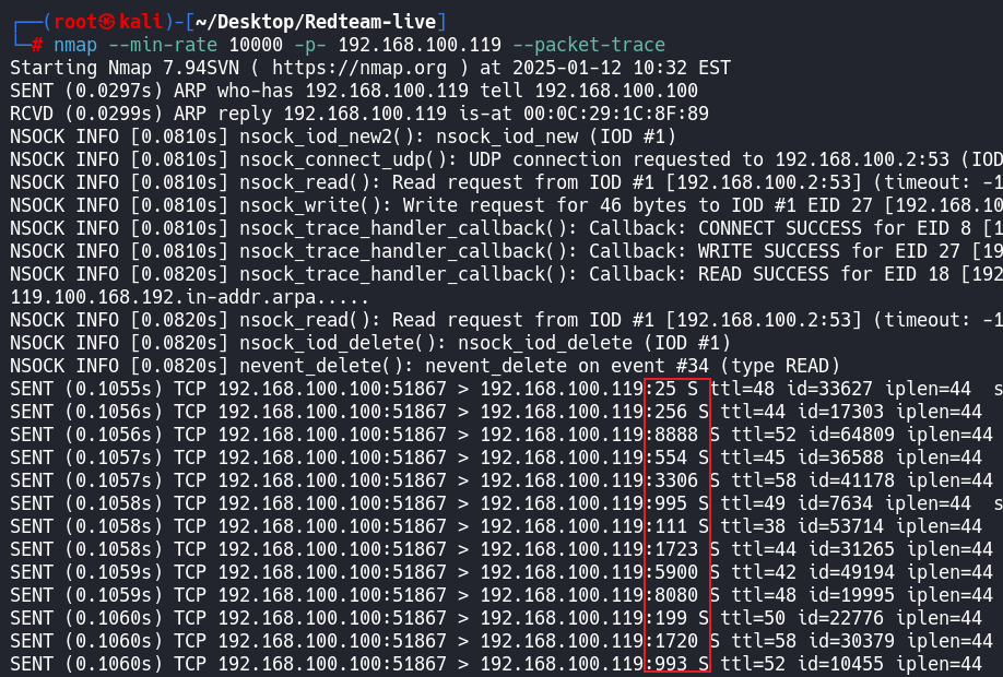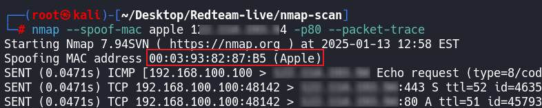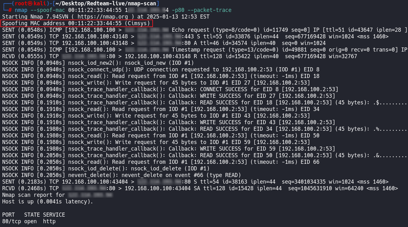 -T<0-5>:时间模板,控制扫描速度和侵入性。--data-length:向数据包添加额外字节,用于扰乱检测机制。--badsum:发送伪造校验和的包,用于测试目标防御的严格性。--source-port:伪造源端口,实现特定流量模式。--spoof-mac:随机或指定 MAC 地址伪造。