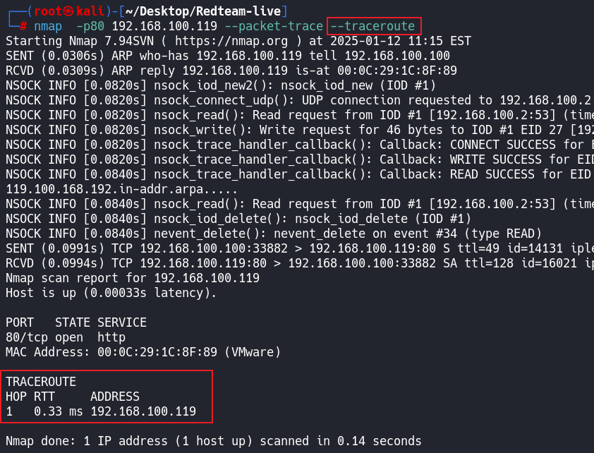 -r:顺序扫描端口,而不是随机顺序(默认是随机扫描)。-vvv:超详细模式,显示更全面的信息,包括每个扫描步骤的细节。-F:快速扫描,仅检查常用的 100 个端口。-sV:服务版本探测,获取运行服务的具体版本信息。--traceroute:追踪到目标主机的路由路径。