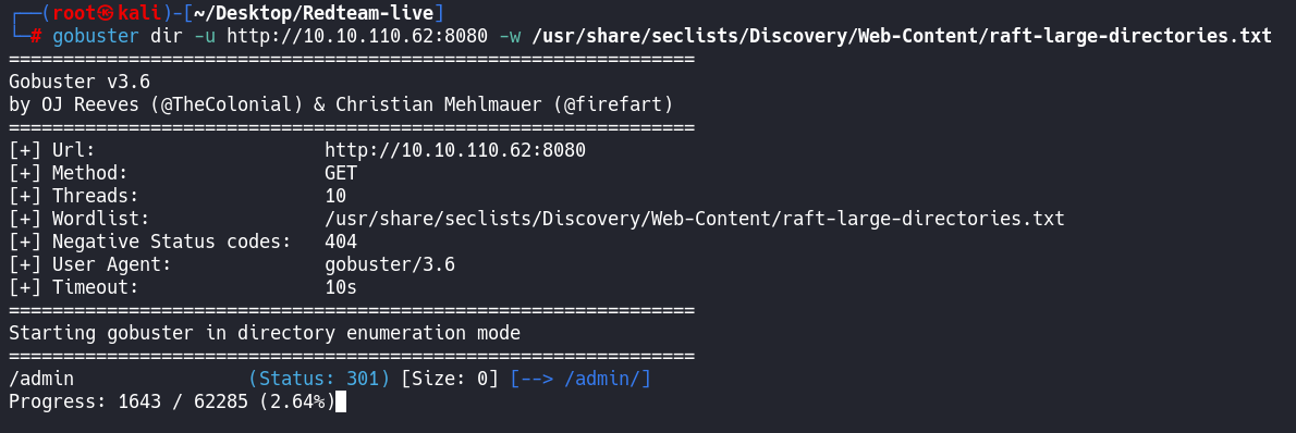 └─# gobuster dir -u http://10.10.110.62:8080 -w /usr/share/seclists/Discovery/Web-Content/raft-large-directories.txt