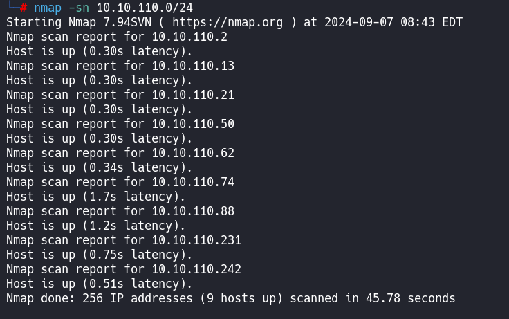 Nmap done: 256 IP addresses (9 hosts up) scanned in 945.83 seconds┌──(root㉿kali)-[~/Desktop/Redteam-live]