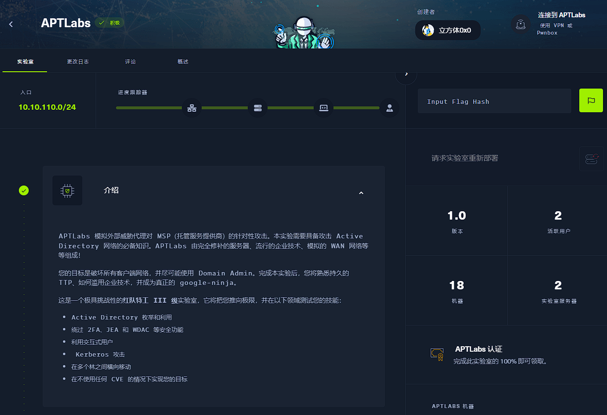 APTLabs 模拟外部威胁代理对 MSP(托管服务提供商)的针对性攻击。本实验需要具备攻击 Active Directory 网络的必备知识。APTLabs 由完全修补的服务器、流行的企业技术、模拟的 WAN 网络等等组成!