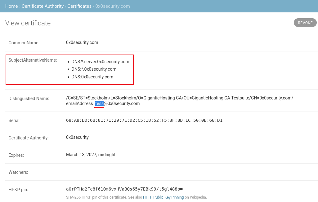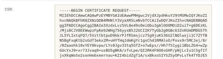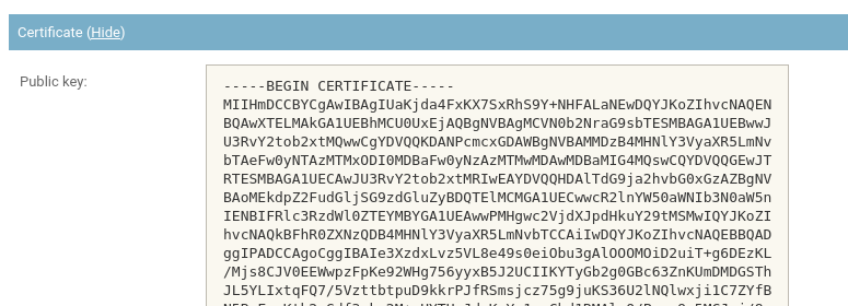 -----BEGIN CERTIFICATE-----MIIEdzCCA1+gAwIBAgIJAO8Y/EXyUuJyMA0GCSqGSIb3DQEBCwUAMIGDMQswCQYD...-----END CERTIFICATE-----