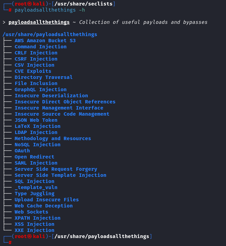 ┌──(root㉿kali)-[/usr/share/seclists] └─# payloadsallthethings -h > payloadsallthethings ~ Collection of useful payloads and bypasses /usr/share/payloadsallthethings ├── AWS Amazon Bucket S3 ├── Command Injection ├── CRLF Injection ├── CSRF Injection ├── CSV Injection ├── CVE Exploits ├── Directory Traversal ├── File Inclusion ├── GraphQL Injection ├── Insecure Deserialization ├── Insecure Direct Object References ├── Insecure Management Interface ├── Insecure Source Code Management ├── JSON Web Token ├── LaTeX Injection ├── LDAP Injection ├── Methodology and Resources ├── NoSQL Injection ├── OAuth ├── Open Redirect ├── SAML Injection ├── Server Side Request Forgery ├── Server Side Template Injection ├── SQL Injection ├── _template_vuln ├── Type Juggling ├── Upload Insecure Files ├── Web Cache Deception ├── Web Sockets ├── XPATH Injection ├── XSS Injection └── XXE Injection ┌──(root㉿kali)-[/usr/share/payloadsallthethings] └─#rockyou.txt: 经典。通常在/usr/share/wordlists/rockyou.txt.gz,需要先解压 (gzip -d /usr/share/wordlists/rockyou.txt.gz)。