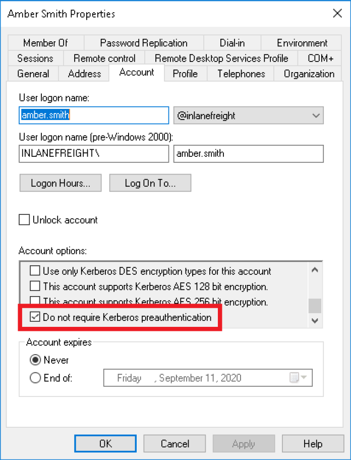 AD 用户账户属性中勾选了 "Do not require Kerberos preauthentication"。