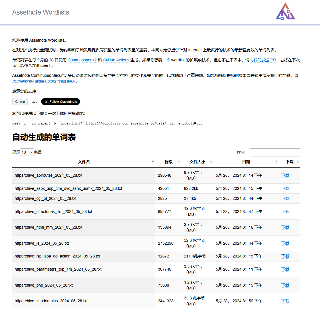 assetnote/wordlists仓库。由 AssetNote 团队维护,讲师团队的爆破手推荐