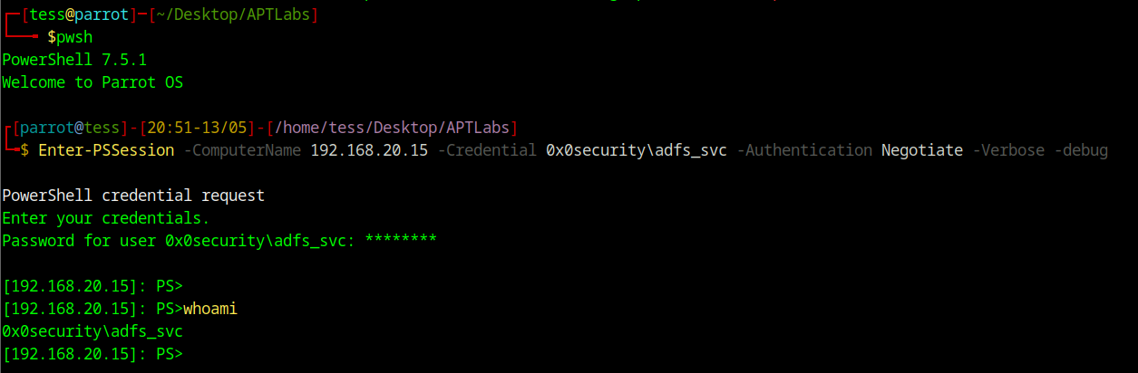 ┌─[tess@parrot]─[~/Desktop/APTLabs] └──╼ $pwsh PowerShell 7.5.1 Welcome to Parrot OS ┌[parrot@tess]-[20:51-13/05]-[/home/tess/Desktop/APTLabs] └╼$ Enter-PSSession -ComputerName 192.168.20.15 -Credential 0x0security\adfs_svc -Authentication Negotiate -Verbose -debug PowerShell credential request Enter your credentials. Password for user 0x0security\adfs_svc: ******** [192.168.20.15]: PS> [192.168.20.15]: PS>whoami 0x0security\adfs_svc [192.168.20.15]: PS>
