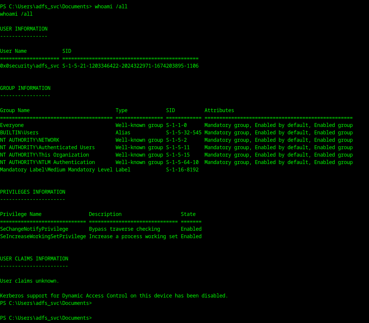 PS C:\Users\adfs_svc\Documents> 执行 whoami /priv 查看当前用户权限,发现只有两个基本权限: