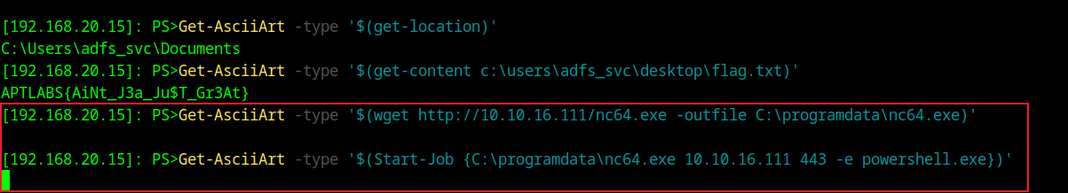 nxc标记为Pwn3d!,且我们通过 JEA 绕过获得了看似“完整”的 PowerShell Shell,但adfs_svc用户的实际权限由于 JEA 的多维度限制(如运行上下文可能是虚拟账户,能执行的底层操作受限等),仍然远未达到系统管理员级别。这是一个重要的认知升级:工具的判断(如