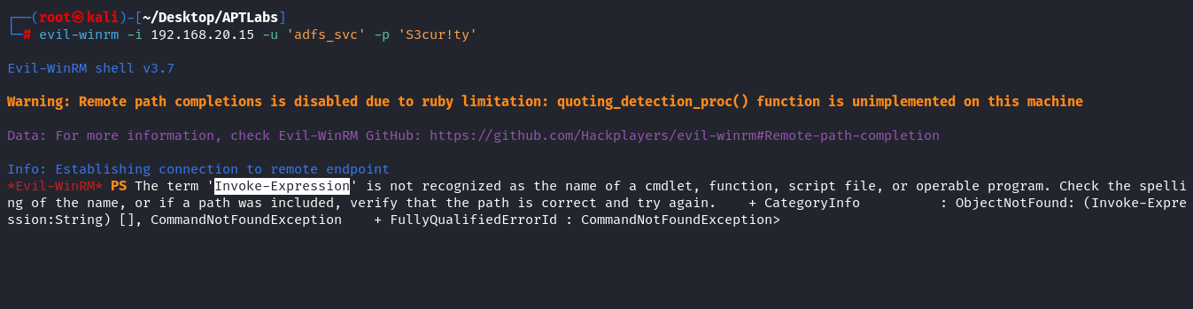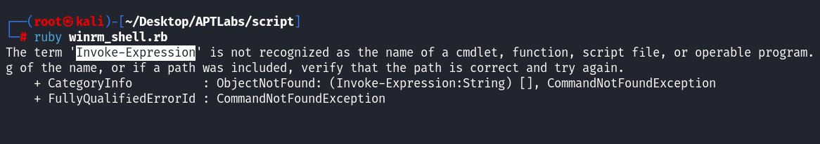 evil-winrm的报错( invoke-expression 不被识别)提示其实现方式可能与当前环境不完全兼容。