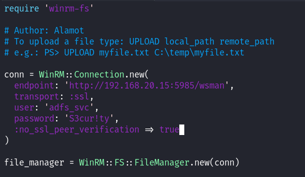 winrm_shell.rb脚本。# winrm_shell.rb require 'winrm-fs' # Author: Alamot # To upload a file type: UPLOAD local_path remote_path # e.g.: PS> UPLOAD myfile.txt C:\temp\myfile.txt conn = WinRM::Connection.new( endpoint: 'http://192.168.20.15:5985/wsman', transport: :ssl, user: 'adfs_svc', password: 'S3cur!ty', :no_ssl_peer_verification => true ) file_manager = WinRM::FS::FileManager.new(conn)