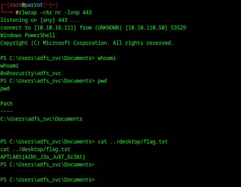 PS C:\users\adfs_svc\desktop> cd ../../administrator.0X0SECURITY
