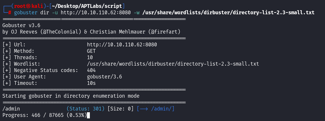 gobuster dir -u http://10.10.110.62:8080 -w /usr/share/wordlists/dirbuster/directory-list-2.3-small.txt