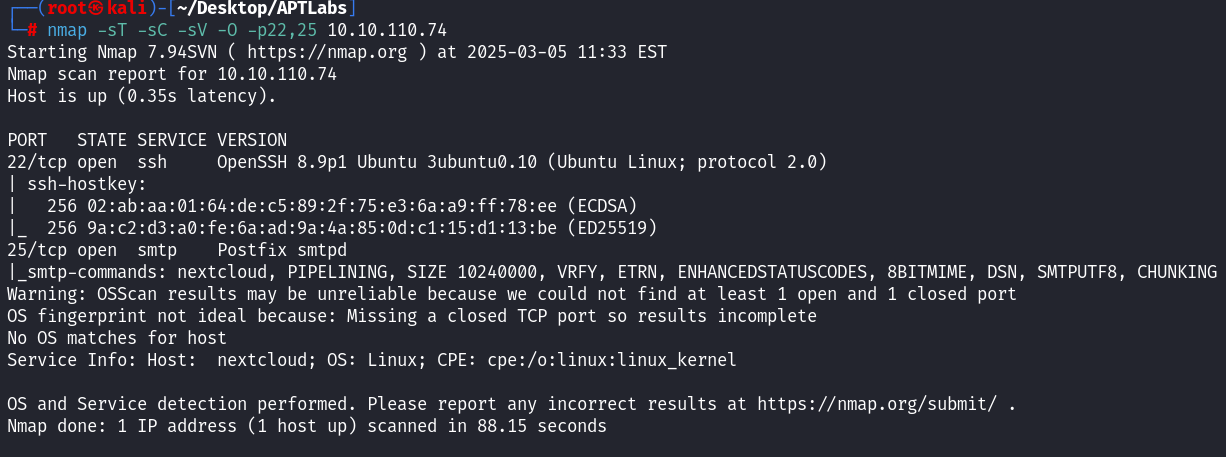 ┌──(root㉿kali)-[~/Desktop/APTLabs] └─# nmap -sT -sC -sV -O -p22,25 10.10.110.74 Starting Nmap 7.94SVN ( https://nmap.org ) at 2025-03-05 11:33 EST Nmap scan report for 10.10.110.74 Host is up (0.35s latency). PORT STATE SERVICE VERSION 22/tcp open ssh OpenSSH 8.9p1 Ubuntu 3ubuntu0.10 (Ubuntu Linux; protocol 2.0) | ssh-hostkey: | 256 02:ab:aa:01:64:de:c5:89:2f:75:e3:6a:a9:ff:78:ee (ECDSA) |_ 256 9a:c2:d3:a0:fe:6a:ad:9a:4a:85:0d:c1:15:d1:13:be (ED25519) 25/tcp open smtp Postfix smtpd |_smtp-commands: nextcloud, PIPELINING, SIZE 10240000, VRFY, ETRN, ENHANCEDSTATUSCODES, 8BITMIME, DSN, SMTPUTF8, CHUNKING Warning: OSScan results may be unreliable because we could not find at least 1 open and 1 closed port OS fingerprint not ideal because: Missing a closed TCP port so results incomplete No OS matches for host Service Info: Host: nextcloud; OS: Linux; CPE: cpe:/o:linux:linux_kernel OS and Service detection performed. Please report any incorrect results at https://nmap.org/submit/ . Nmap done: 1 IP address (1 host up) scanned in 88.15 seconds
