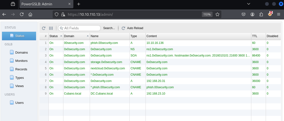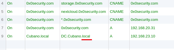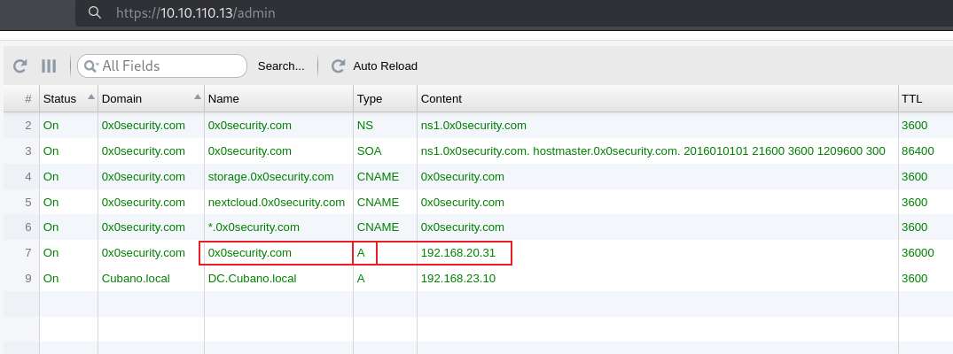 这里的内容是重要信息,拿下来保存好{ "status": "success", "records": [ { "status": "On", "content": "ns1.0x0security.com", "domain": "0x0security.com", "name": "0x0security.com", "weight": 0, "style": "color: green", "disabled": 0, "ttl": 3600, "fallback": 0, "view": "Public", "name_type": "NS", "persistence": 0, "monitor": "No check" }, { "status": "On", "content": "ns1.0x0security.com. hostmaster.0x0security.com. 2016010101 21600 3600 1209600 300", "domain": "0x0security.com", "name": "0x0security.com", "weight": 0, "style": "color: green", "disabled": 0, "ttl": 86400, "fallback": 0, "view": "Public", "name_type": "SOA", "persistence": 0, "monitor": "No check" }, { "status": "On", "content": "0x0security.com", "domain": "0x0security.com", "name": "storage.0x0security.com", "weight": 0, "style": "color: green", "disabled": 0, "ttl": 3600, "fallback": 0, "view": "Public", "name_type": "CNAME", "persistence": 0, "monitor": "No check" }, { "status": "On", "content": "0x0security.com", "domain": "0x0security.com", "name": "nextcloud.0x0security.com", "weight": 0, "style": "color: green", "disabled": 0, "ttl": 3600, "fallback": 0, "view": "Public", "name_type": "CNAME", "persistence": 0, "monitor": "No check" }, { "status": "On", "content": "0x0security.com", "domain": "0x0security.com", "name": "*.0x0security.com", "weight": 0, "style": "color: green", "disabled": 0, "ttl": 3600, "fallback": 0, "view": "Public", "name_type": "CNAME", "persistence": 0, "monitor": "No check" }, { "status": "On", "content": "192.168.20.31", "domain": "0x0security.com", "name": "0x0security.com", "weight": 0, "style": "color: green", "disabled": 0, "ttl": 36000, "fallback": 0, "view": "Public", "name_type": "A", "persistence": 0, "monitor": "No check" }, { "status": "On", "content": "192.168.23.10", "domain": "Cubano.local", "name": "DC.Cubano.local", "weight": 0, "style": "color: green", "disabled": 0, "ttl": 3600, "fallback": 0, "view": "Public", "name_type": "A", "persistence": 0, "monitor": "No check" } ], "total": 7 }