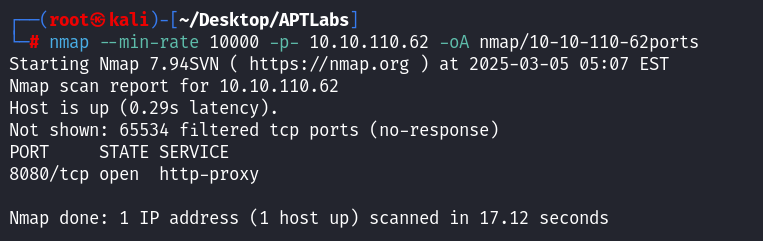 ┌──(root㉿kali)-[~/Desktop/APTLabs] └─# nmap --min-rate 10000 -p- 10.10.110.62 -oA nmap/10-10-110-62ports Starting Nmap 7.94SVN ( https://nmap.org ) at 2025-03-05 05:07 EST Nmap scan report for 10.10.110.62 Host is up (0.29s latency). Not shown: 65534 filtered tcp ports (no-response) PORT STATE SERVICE 8080/tcp open http-proxy Nmap done: 1 IP address (1 host up) scanned in 17.12 seconds┌──(root㉿kali)-[~/Desktop/APTLabs] └─# nmap -sT -sC -sV -O -p 8080 10.10.110.62 Starting Nmap 7.94SVN ( https://nmap.org ) at 2025-03-05 05:13 EST WARNING: Service 10.10.110.62:8080 had already soft-matched rtsp, but now soft-matched sip; ignoring second value Nmap scan report for 10.10.110.62 Host is up (0.36s latency). PORT STATE SERVICE VERSION 8080/tcp open rtsp |_rtsp-methods: ERROR: Script execution failed (use -d to debug) |_http-title: Not Found | fingerprint-strings: | FourOhFourRequest, GetRequest, HTTPOptions: | HTTP/1.0 404 Not Found | Content-Type: text/html | X-Frame-Options: DENY | Content-Length: 179 | X-Content-Type-Options: nosniff | <!doctype html> | <html lang="en"> | <head> | <title>Not Found</title> | </head> | <body> | <h1>Not Found</h1><p>The requested resource was not found on this server.</p> | </body> | </html> | RTSPRequest: | RTSP/1.0 404 Not Found | Content-Type: text/html | X-Frame-Options: DENY | Content-Length: 179 | X-Content-Type-Options: nosniff | <!doctype html> | <html lang="en"> | <head> | <title>Not Found</title> | </head> | <body> | <h1>Not Found</h1><p>The requested resource was not found on this server.</p> | </body> | </html> | SIPOptions: | SIP/2.0 404 Not Found | Content-Type: text/html | X-Frame-Options: DENY | Content-Length: 179 | X-Content-Type-Options: nosniff | <!doctype html> | <html lang="en"> | <head> | <title>Not Found</title> | </head> | <body> | <h1>Not Found</h1><p>The requested resource was not found on this server.</p> | </body> |_ </html> 1 service unrecognized despite returning data. If you know the service/version, please submit the following fingerprint at https://nmap.org/cgi-bin/submit.cgi?new-service : SF-Port8080-TCP:V=7.94SVN%I=7%D=3/5%Time=67C823D9%P=x86_64-pc-linux-gnu%r( SF:GetRequest,133,"HTTP/1\.0\x20404\x20Not\x20Found\r\nContent-Type:\x20te SF:xt/html\r\nX-Frame-Options:\x20DENY\r\nContent-Length:\x20179\r\nX-Cont SF:ent-Type-Options:\x20nosniff\r\n\r\n\n<!doctype\x20html>\n<html\x20lang SF:=\"en\">\n<head>\n\x20\x20<title>Not\x20Found</title>\n</head>\n<body>\ SF:n\x20\x20<h1>Not\x20Found</h1><p>The\x20requested\x20resource\x20was\x2 SF:0not\x20found\x20on\x20this\x20server\.</p>\n</body>\n</html>\n")%r(HTT SF:POptions,133,"HTTP/1\.0\x20404\x20Not\x20Found\r\nContent-Type:\x20text SF:/html\r\nX-Frame-Options:\x20DENY\r\nContent-Length:\x20179\r\nX-Conten SF:t-Type-Options:\x20nosniff\r\n\r\n\n<!doctype\x20html>\n<html\x20lang=\ SF:"en\">\n<head>\n\x20\x20<title>Not\x20Found</title>\n</head>\n<body>\n\ SF:x20\x20<h1>Not\x20Found</h1><p>The\x20requested\x20resource\x20was\x20n SF:ot\x20found\x20on\x20this\x20server\.</p>\n</body>\n</html>\n")%r(RTSPR SF:equest,133,"RTSP/1\.0\x20404\x20Not\x20Found\r\nContent-Type:\x20text/h SF:tml\r\nX-Frame-Options:\x20DENY\r\nContent-Length:\x20179\r\nX-Content- SF:Type-Options:\x20nosniff\r\n\r\n\n<!doctype\x20html>\n<html\x20lang=\"e SF:n\">\n<head>\n\x20\x20<title>Not\x20Found</title>\n</head>\n<body>\n\x2 SF:0\x20<h1>Not\x20Found</h1><p>The\x20requested\x20resource\x20was\x20not SF:\x20found\x20on\x20this\x20server\.</p>\n</body>\n</html>\n")%r(FourOhF SF:ourRequest,133,"HTTP/1\.0\x20404\x20Not\x20Found\r\nContent-Type:\x20te SF:xt/html\r\nX-Frame-Options:\x20DENY\r\nContent-Length:\x20179\r\nX-Cont SF:ent-Type-Options:\x20nosniff\r\n\r\n\n<!doctype\x20html>\n<html\x20lang SF:=\"en\">\n<head>\n\x20\x20<title>Not\x20Found</title>\n</head>\n<body>\ SF:n\x20\x20<h1>Not\x20Found</h1><p>The\x20requested\x20resource\x20was\x2 SF:0not\x20found\x20on\x20this\x20server\.</p>\n</body>\n</html>\n")%r(SIP SF:Options,132,"SIP/2\.0\x20404\x20Not\x20Found\r\nContent-Type:\x20text/h SF:tml\r\nX-Frame-Options:\x20DENY\r\nContent-Length:\x20179\r\nX-Content- SF:Type-Options:\x20nosniff\r\n\r\n\n<!doctype\x20html>\n<html\x20lang=\"e SF:n\">\n<head>\n\x20\x20<title>Not\x20Found</title>\n</head>\n<body>\n\x2 SF:0\x20<h1>Not\x20Found</h1><p>The\x20requested\x20resource\x20was\x20not SF:\x20found\x20on\x20this\x20server\.</p>\n</body>\n</html>\n"); Warning: OSScan results may be unreliable because we could not find at least 1 open and 1 closed port OS fingerprint not ideal because: Missing a closed TCP port so results incomplete No OS matches for host OS and Service detection performed. Please report any incorrect results at https://nmap.org/submit/ . Nmap done: 1 IP address (1 host up) scanned in 34.46 seconds