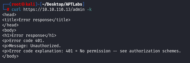 使用-L选项让curl自动跟随重定向:┌──(root㉿kali)-[~/Desktop/APTLabs] └─# curl -k -L -u admin:admin https://10.10.110.13/admin <!DOCTYPE html> <html lang="en"> <meta content="text/html; charset=utf-8" http-equiv="content-type"/> <head> <title>PowerGSLB: Admin</title> <link href="src/w2ui-1.4.3.min.css" rel="stylesheet" type="text/css"/> <script src="src/jquery-2.2.4.min.js" type="text/javascript"></script> <script src="src/w2ui-1.4.3.min.js" type="text/javascript"></script> <script src="src/powergslb-1.0.0.js" type="text/javascript"></script> </head> <body> <div id="powergslb" style="width: 100%; height: 96vh;"></div> </body> </html> ┌──(root㉿kali)-[~/Desktop/APTLabs] └─#