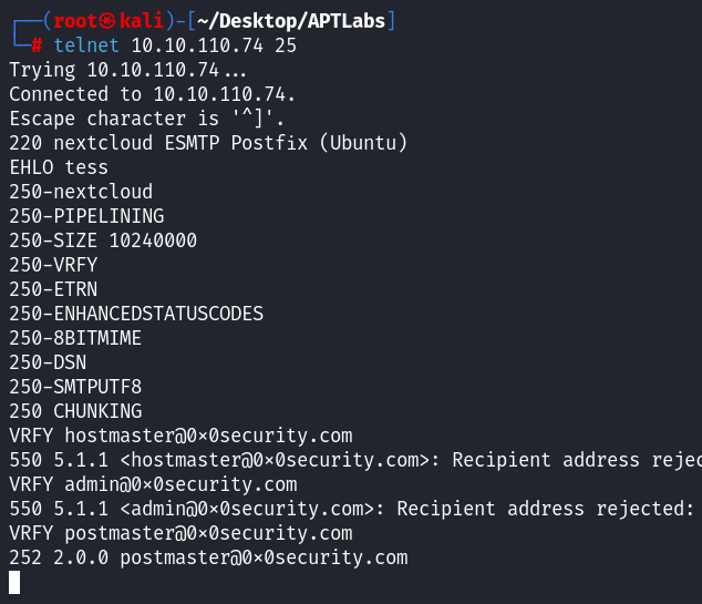 220,250,550等)、命令 (HELO/EHLO,VRFY,MAIL FROM,RCPT TO…) 的作用与意义。Postfix 的常见扩展、验证邮箱在社工或钓鱼中的价值。