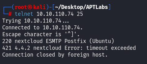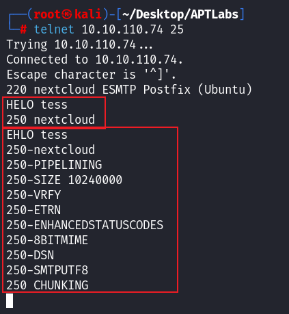 telnet 10.1.1.74 25或者nc 10.1.1.74 25等方式连接 SMTP 服务器,观察其返回的 Banner