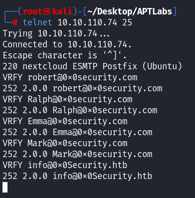 nextcloud.xxx、storage.xxx的时候,要懂得怎么联想到“同 IP 可能绑定多个域名”,并在hosts进行配置访问。SMTP 协议、Telnet 交互、邮件验证等,都属于看似“古老”却仍在大量使用的技术点,尤其在靶场或实战中屡屡出现。