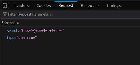 成功发现:在搜索条件处,加入特定的 闭合字符和逻辑(例如 tess ' ) or 1 = 1 -- - 或在后面再补一个括号之类),能够触发 SQL 成功执行。